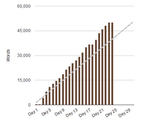I was worried and scared at the beginning of the month. I was daunted by the challenge of writing 50,000 words in 30 days. But is hasn’t been all that hard. I started with some rules and guidelines, which I followed pretty well. If you look at my graph, you can see my steady progress.