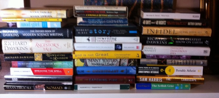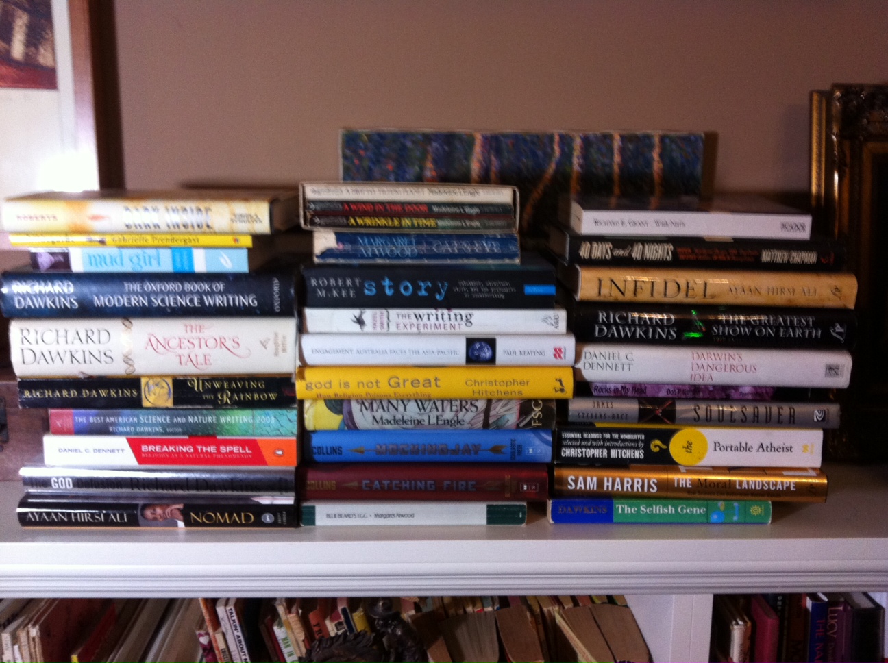 A whole bunch of books written or edited by Richard Dawkins, who I met at an atheist conference in DC. One of the coolest scenes I’ve ever experienced.