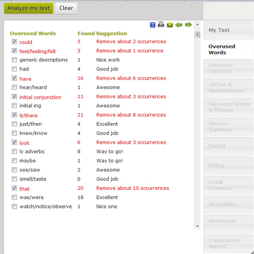 Well, I found that I suck. I wasn’t very surprised. It seems I have way too many overused words and too much repetition. My sentence length variety seems to be okay, so that’s good. Like Sherrie, I found the cutesy encouragement “nice work” or “good job” to be a bit patronizing. But that’s easy enough to ignore.